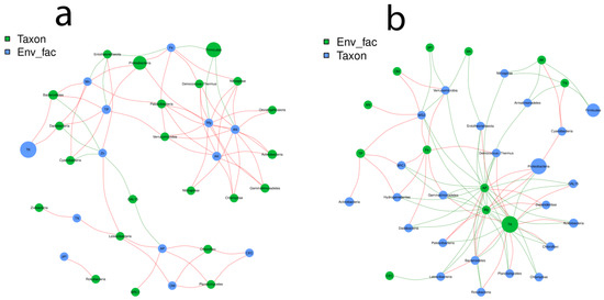 Statistical correlations underpin bacterial community co-occurrence patterns and molecular ecological networks. Distinct networks were constructed for ASVs of each plant organ and rhizosphere soil at three phonological stages. Before network construction, MENA was used in conjunction with random matrix theory (RMT)-based algorithms to automatically find the suitable similarity threshold or the minimal strength of the link between each pair of nodes [132]. Another network analysis was shown to compute the consequence of edaphic soil factors on the bacterial community structuring in grapevines under control and treatment plants. To measure the co-occurrence, Spearman’s correlation factor (r > 0.6 or r < −0.6) was incorporated into the abundance profile of each Asv and the soil factor, which was analysed by R. Furthermore, the significant relationship at p < 0.05 between soil and bacterial abundance was visualized in CYTOSCAPE (Version 3.7.2).