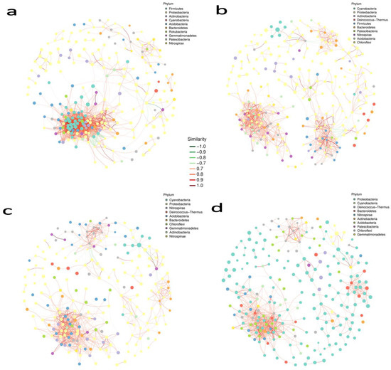 Network analysis of grape rhizosphere and phyllosphere bacterial communities. ASVs with less than 10 total sequences and less than 5 samples were filtered out. Nodes denote different interacting phyla. The top 10 modules (phyla) with the most significant number of interacting nodes are shown with their respective colours. Node size is proportional to the abundance. Edges connect different nodes with red and green lines as positive and negative correlations, respectively. (a) Rhizosphere soil, (b) white roots, (c) leaves, (d) berry.