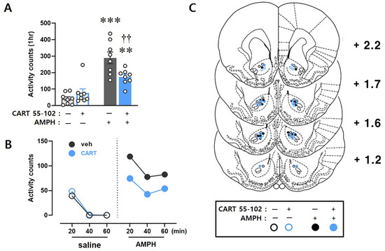 Consistent with previous studies [11,16], microinjection of CART peptide 55–102 (2.5 µg/0.5 µL/side) into the NAcc core significantly inhibited the AMPH-induced hyperlocomotor activity (p < 0.01 by post hoc Tukey comparisons), while the basal locomotor activity was not changed by CART peptide 55–102 alone in the absence of AMPH. Time-course analyses of these findings showed that the ability of the CART peptide 55–102 to inhibit AMPH-induced hyperlocomotor activity was apparent throughout the 1 h time course (Figure 1B). The locations of the injection cannula tips used in these experiments are shown in Figure 1C.