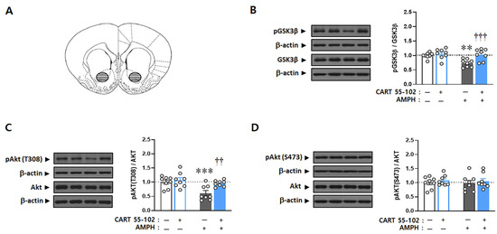 2.2. CART Peptide 55–102 in the NAcc Core Inhibits the AMPH-Induced Decreases in pAkt (T308) and pGSK3β