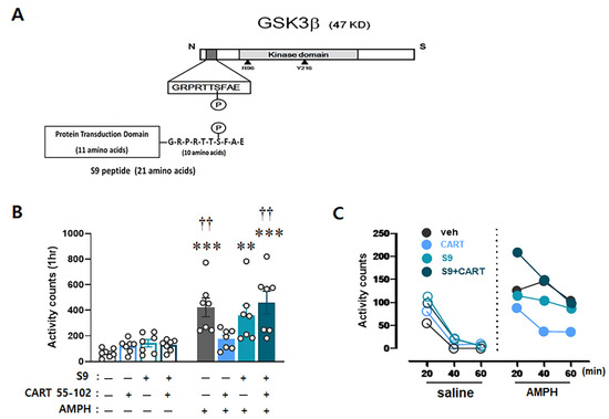 Interruption of Akt-GSK3β signaling in the NAcc core abolishes inhibitory effects of CART peptide 55–102 on AMPH-induced locomotor activity. (A) A diagram showing the S9 peptide with short amino acid sequences competitive against a phosphorylation site at serine 9 of endogenous GSK3β. (B) Data are shown as group mean (+S.E.M.) total locomotor activity counts observed during the 1 h test after the bilateral microinjection of saline, CART peptide 55–102 (2.5 µg/0.5 µL/side), or S9 peptide (5.0 µg/0.5 µL/side) into the NAcc core immediately followed by saline or AMPH (1 mg/kg) IP injection. Symbols indicate significant differences revealed by post hoc Tukey comparisons following two-way ANOVA. ** p < 0.01, *** p < 0.001, significantly more counts compared to saline—saline microinjections + saline IP injection. †† p < 0.01, significant differences compared to saline—CART 55–102 microinjections + AMPH IP injection. The number of rats in each group is 7. (C) Time-course data are shown as group mean locomotor activity counts at 20 min intervals obtained during the 1 h following microinjections (saline, CART 55–102 or S9) + IP (saline or AMPH) injection.