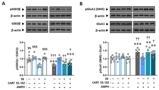 It has been shown that GSK3β is closely bound to GluA1 to regulate its activity in the hippocampus [36], and the GSK3β inhibitor decreases the surface and total protein levels of GluA1 in the prefrontal neurons [37]. In the same line with these findings, our present results suggest that phosphorylation of GluA1 is possibly under the regulation of GSK3β in the NAcc core, and CART peptide 55–102 disrupts this signal pathway by increasing GSK3β phosphorylation. However, as it is known that other kinases also influence phosphorylation of GluA1 at Ser845 (e.g., protein kinase A) [50], it is not certain whether the increase in its phosphorylation by AMPH is directly caused by activation of GSK3β or indirectly through other kinases. To examine whether GluA1 is under the regulation of GSK3β and CART peptide 55–102 disrupts this signal pathway, we co-microinjected S9 peptide, a potential activator for GSK3β, by competing with Akt against its phosphorylation, [30,51,52], with CART peptide 55–102 and measured phosphorylation levels of GSK3β and GluA1. As shown in Figure 5, the blockade effect of CART peptide 55–102 on AMPH-induced changes in GSK3β and GluA1 signaling was nullified in the presence of the S9 peptide, subsequently exerting the same effects on the locomotor activity (Figure 4). These results indicate that GSK3β more likely regulates the Ser845 phosphorylation level of GluA1, and interruption of this pathway in the NAcc core is a crucial step for the CART peptide to negatively regulate AMPH-induced locomotor activity. However, the signaling pathways by which GSK3β reaches GuA1 must be explored in the future.