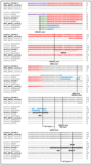 NLS1-2, AT-hook 1-2, and CTDβ sequences were not found in any of the potential isoforms from UniProt (Updated 15 October 2022).
