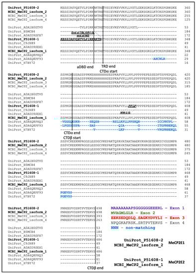 MECP2 human gene was identified in the NCBI database (Gene ID: 4204). GenBank records for all 10 transcripts relevant to the 4204 gene were extracted as a .gb file. From the file, XM_ sequences were identified and excluded from this study as being non-reviewed. “Comment” sections of each record were analyzed to identify MeCP2E1 (also known as MeCP2α or MeCP2B) and MeCP2E2 (also known as MeCP2β or MeCP2A) coding transcripts. Information about the difference between MECP2E1/E2 and other transcripts as well as encoded protein isoforms was also extracted from the “Comment” sections. “Evidence-Data” codes were interpreted using Evidenceontology.org [61]. NCBI respective protein sequences encoded by 10 transcripts were extracted as a .gp file. UniProt record for human MeCP2 protein (P51608) has also been analyzed. Eight potential protein isoform record sequences and 2 reviewed sequences were extracted from the record. Additionally, from each potential isoform record, Ensembl cross-references were extracted from the “Genome annotation databases” section. Then, Ensembl transcript support level was used to assess the quality of the sequences. Then, selected sequences were aligned using ClustalOmega [62] multiple sequence alignment web tool. Exon nucleotide sequences were retrieved from NG_007107.3 human MECP2 record and translated using Expasy “Translate” tool [63]. Then, the translated exons sequences from the appropriate reading frames were highlighted in the alignment. The following functional groups were also labelled on the alignment: methyl-CpG-binding domain (MBD) sequence [64,65], transcriptional-repression domain (TRD) [55], high mobility group-like domains 1 and 2 (HMGD1 and 2) [65], nuclear localization signals 1 and 2 (NLS1 and 2) [65], alternative DNA binding domain (aDBD) [65], group 2 WW motif-containing protein interaction region (WW-2) [65], histone H3 methyltransferase interaction region [65], two AT hooks (from UniProt P51608 record), TBL1XR1 interaction region (from UniProt P51608 record), NCoR/SMRT interaction domain (NID) [22], C-terminal domains α and β (CTDα and CTDβ) [65] (Supplementary Table S1). To find the origin of the reference non-matching sequences, cDNA of Ensembl transcript sequences, from which UniProt isoforms were derived, was used as a query for UCSC BLAT [66] along with the reference exon sequences for the human MECP2 gene extracted from NCBI. The output of BLAT was visualized in the UCSC genome viewing browser in the form of mapping of query sequences to the hg38 version of the human genome (Supplementary Figure S1). All information collected from the databases and alignment analysis were summarized in Table 1, Table 2, Table 3 and Table 4. The data were last verified on 15 October 2022.