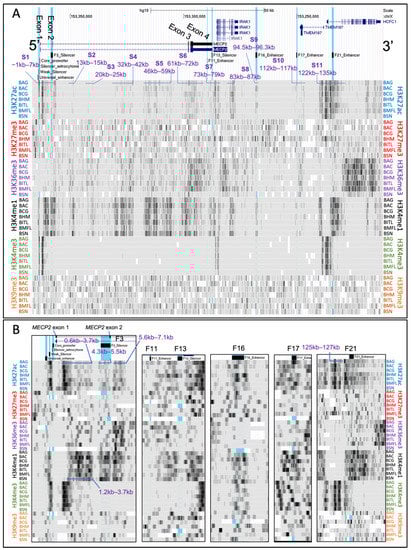 On the scale of 50 kb, the trends in H3K27ac and H3K4me1 abundance appear to have a high degree of similarity, with the exception of 125–127 kb region upstream of the MECP2 TSS, which is enriched in H3K27ac, H3K4me3 and low in H3K4me1 (Figure 3A,B). Interestingly, H3K36me3 was highly abundant at the S1–S6, and S10 genomic segments, but low at the S7, S8, S9 and S11. Instead, H3K36me3 was highly abundant between S6 and S7; S7 and S8; S8 and S9; and from the 3′ end of S11 in the HCFC1 gene. H3K4Me3 abundance was high at the S1, S7, and S11 regions, which included promoters of the MECP2, IRAK1 and TMEM187/HCFC1 genes, respectively. H3K27me3 and H3K9me3 modification density peaks were evenly scattered throughout the MECP2 gene and its cis-regulatory elements. There was a consistent increase in H3K27me3 histone PTMs upstream of the MECP2 universal enhancer in 7 brain regions, but peaks did not converge on a certain genomic fragment and were rather scattered. To closely examine the MECP2 cis-regulatory elements, we zoomed in to distinguish smaller features (Figure 3B).