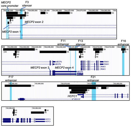 Summary of the identified genomic segments potentially involved in regulation of the MECP2 gene. The identified genomic segments of interest were added to the hg38 human genome in UCSC genome viewing browser. Previously published F elements were highlighted blue and labelled on top of each pane. “S” fragments: histone PTMs in various brain regions (Figure 3), “A” fragments: highly accessible chromatin in different fetal tissues based on DNA-seq (Figure 4), “B” fragments: highly accessible chromatin in different brain regions of adults based on ATAC-seq (Figure 5), “H” fragments: hypomethylated genomic regions of mid-frontal gyrus in individuals 35d to 25 years old (Figure 6). Direction is 5′–3′ (sense direction relative to the MECP2 gene).