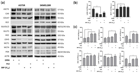 Expression of metabolic proteins in vemurafenib (PLX)-resistant melanoma cells treated with 3-bromopyruvate (3BP) for 24 h. (a) Western blot analysis of the levels of ASCT2, CA9, CD147, GLS, GLUD1/2, GLUT1, HK2, LDH5, MCT1, MCT4, and PDK in PLX-resistant melanoma cells treated with IC50 3BP, either alone or combined with PLX (4.5 µM for A375R and 6.0 µM for SKMEL28R), for 24 h. (b) Quantification of immunoblots normalized to ACTB levels in A375R melanoma cells. (c) Quantification of immunoblots normalized to ACTB levels in SKMEL28R melanoma cells. The y-axis represents arbitrary units [a.u.]. The positive signs in the bar charts indicate the presence of a defined treatment. Data represent the mean ± SEM of at least three independent experiments. * p ≤ 0.05; ** p ≤ 0.01.