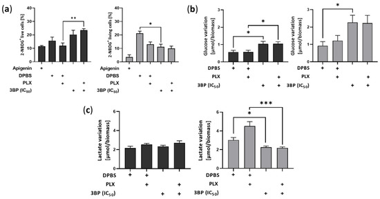 Analysis of variation in extracellular glucose and lactate levels in vemurafenib (PLX)-resistant melanoma cells treated with 3-bromopyruvate (3BP). PLX-resistant melanoma cells were treated with IC50 3BP, either alone or combined with PLX (4.5 µM for A375R cells and 6.0 µM for SKMEL28R cells). (a) Glucose uptake in PLX-resistant melanoma cells treated for 4 h after 7-aminoactinomycin D (7AAD)/2-(N-(7-nitrobenz-2-oxa-1,3-diazol-4-yl)amino)-2-deoxyglucose (2NBDG) staining. Data represent the percentage of total cell counts of 7AAD− and 2NBDG+; (b) glucose variation (influx) in PLX-resistant melanoma cells treated for 24 h. Data were calculated by the difference between µmol of glucose in culture media at 0 h and after 24 h of treatment. Data were normalized by cell viability analysis using a sulforhodamine B (SRB) assay. (c) Lactate variation (efflux) in PLX-resistant melanoma cells treated for 24 h. Data were calculated by the difference between µmol of lactate in culture media after 24 h of treatment and at 0 h. Data were normalized by cell viability analysis using a sulforhodamine B (SRB) assay. Dark gray represents A375R cells; light gray represents SKMEL28R cells. The positive signs in the bar charts indicate the presence of a defined treatment. Data represent the mean ± SEM of at least three independent experiments performed in triplicate. * p ≤ 0.05; ** p ≤ 0.01; *** p ≤ 0.001.
