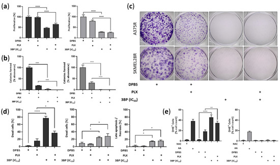 To determine whether the viability impairment caused by 3BP was due to the decline in cell division, a proliferation assay was performed (Figure 4a). The results showed that 3BP decreases cell proliferation in a PLX-independent manner in both the A375R and SKMEL28R cell lines. Supporting these findings, 3BP treatment also significantly restrained the ability of the cell lines to form colonies regardless of the presence of PLX (Figure 4b,c). To determine whether cell death also contributed to the viability decrease caused by 3BP, annexin V and propidium iodide assays were performed (Figure 4d and Figure S4). The results showed that 3BP stimulated A375R and SKMEL28R cell death, independently of PLX. Notably, 3BP monotherapy exhibited a more pronounced effect on A375R cell death than combined therapy. Additionally, 3BP also promoted late apoptosis/necrosis in the SKMEL28R cell line. In an attempt to address other mechanisms of action of 3BP, reactive oxygen species (ROS) release was also evaluated. A significant increase in A375R cells producing ROS was observed after 3BP treatment, although similar results were not observed in the SKMEL28R cell line (Figure 4e and Figure S5).