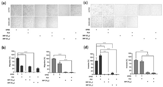 Migration and invasion analysis using the transwell assay in vemurafenib (PLX)-resistant melanoma cells treated with 3-bromopyruvate (3BP) for 24 h. PLX-resistant melanoma cells were treated with IC25 or IC50 3BP, either alone or in combination with PLX (4.5 µM for A375R cells and 6.0 µM for SKMEL28R cells), for 24 h. (a) representative migratory PLX-resistant melanoma cells stained with hematoxylin and eosin; (b) graphic representation of migratory cell count; (c) representative invasive PLX-resistant melanoma cells stained with hematoxylin and eosin; (d) graphic representation of invasive cell count. Data were normalized to the vehicle control (100%). Dark gray represents A375R cells; light gray represents SKMEL28R cells. The positive signs in the bar charts indicate the presence of a defined treatment. Data represent the mean ± SEM of at least three independent experiments performed in triplicate. ** p ≤ 0.01; *** p ≤ 0.001; **** p ≤ 0.0001.