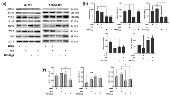 Expression of epithelial-mesenchymal transition (EMT) markers in vemurafenib (PLX)-resistant melanoma cells treated with 3BP for 24 h. (a) Western blot analysis of the levels of ASMA, ECAD, NCAD, SLUG, SNAIL, TGFB, and VIM in PLX-resistant melanoma cells treated with IC50 3-bromopyruvate (3BP), either alone or combined with PLX (4.5 µM for A375R cells and 6.0 µM for SKMEL28R cells), for 24 h. (b) Quantification of immunoblots normalized to ACTB levels in A375R melanoma cells. (c) Quantification of immunoblots normalized to ACTB levels in SKMEL28R melanoma cells. The y-axis represents arbitrary units [a.u.]. The positive signs in the bar charts indicate the presence of a defined treatment. Data represent the mean ± SEM of at least three independent experiments. * p ≤ 0.05; ** p ≤ 0.01; *** p ≤ 0.001.