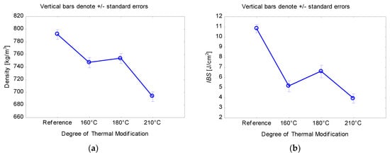 (a) Influence of thermal modification on density; (b) influence of thermal modification on impact bending strength.