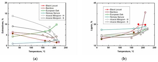 (a) Influence of thermal modification on extractives; (b) influence of thermal modification on lignin (bamboo [19], European oak, Norway spruce [20], Acacia mangium—heartwood, sapwood [21]).