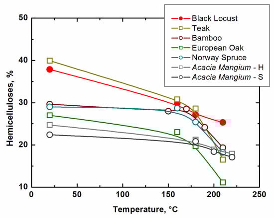 Influence of thermal modification on hemicelluloses (teak [23], bamboo [19], European oak, Norway spruce [20], Acacia mangium—heartwood, sapwood [21]).