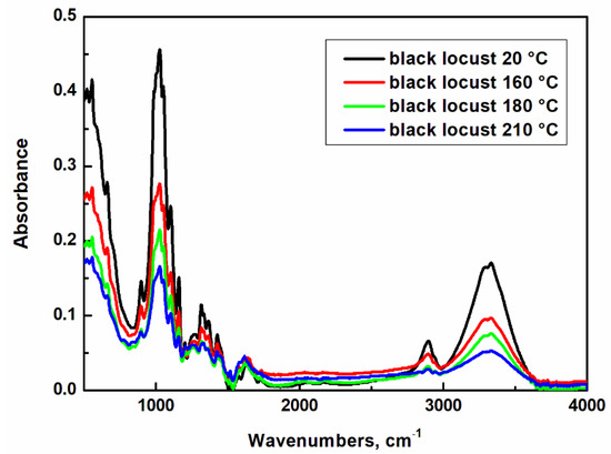 Figure 7 shows individual FT-IR spectra of thermally modified black locust cellulose samples. A broad absorption band around 3400 cm−1 appears during polysaccharides O–H valence vibrations [32,33,35,36]. In our case, when analyzing a thermally modified sample, there is a slight decrease in absorbance at this band due to reduction in free hydroxyl groups compared to the standard untreated wood sample. The bands of the measured spectra with a wavenumber of 2895 cm−1, the region of C–H valence vibrations in methylene groups, have absorbance values almost unchanged depending on the thermal modification at samples modified at lower temperature, and at temperature of 210 °C there is observed a slight decrease [36]. This region (1500–1200 cm−1) is considered to be the “local symmetry” region, which mainly includes deformation vibrations of groups with local symmetry, such as is CH2, and the numerous C-OH deformations found in carbohydrates [37]. However, due to the overlapping of different bands of different vibrations, this region is quite crowded and assigning the observed bands by classical group–frequency correlations is challenging [36]. Nevertheless, it is possible to say that these changes will be related to the increasing proportion of the crystalline region. The band around 1429 cm−1 shows an increase in absorbance due to increasing temperature. Kubovsky et al. [32] state that this may be evidence of an increase in the amount of crystalline cellulose. The absorption band at 1368 cm−1, CH2 deformation vibration in cellulose and hemicelluloses, shows a slight increase due to the thermal modification temperature. Hemicelluloses degrade at the temperature range of 180–350 °C, so there are still some present. The band around 1315 cm−1 refers to the crystallinity of cellulose, where absorbance also increases due to thermal modification. The intensity at 1102 cm−1 decreased for the sample treated at the maximum temperature. The band around 897 cm−1 gradually increased with increasing modification temperature.