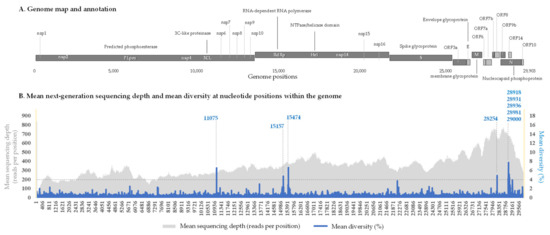 The 110 genomes had been obtained from respiratory samples collected between March 2020 and February 2021 (one year). They were classified in various lineages according to the Nextclade [,], Pangolin [], and World Health Organization (WHO) (https://www.who.int/en/activities/tracking-SARS-CoV-2-variants/ (accessed on 3 October 2022)) classifications. A total of 37 genomes were obtained from respiratory samples collected during the first wave in France from patients diagnosed with SARS-CoV-2- between February and May 2020; they included 22 genomes of Nextstrain lineage 20A; 9 of lineage 20B, and 6 of lineage 20C (Supplementary Table S1). In addition, 66 viral genomes were classified in lineages that we named variants Marseille-1 to Marseille-10. These variants were comprised of ≥30 genomes with a specific set of ≥5 mutations and were all first detected between June and August 2020 []. These 66 genomes included 4 genomes of the Marseille-1 variant (Pangolin lineage B.1.416), 11 genomes of the Marseille-2 variant (B.1.177), 5 genomes of the Marseille-3 variant (B.1), 16 genomes of the Marseille-4 variant (B.1.160), 9 genomes of the Marseille-5 variant (B.1.367), 3 genomes of the Marseille-6 variant (B.1), 4 genomes of the Marseille-7 variant (B.1.416.1), 5 genomes of the Marseille-8 variant (B.1.1.269), 4 genomes of the Marseille-9 variant (B.1.1.241), and 5 genomes of the Marseille-10 variant (B.1.221). Finally, 6 genomes were classified as of the Alpha variant (B.1.1.7) and one was classified as of the Beta variant (B.1.351). For these 110 genomes, the mean intra-sample genetic diversity at nucleotide positions within the genome (in %) as well as the mean next-generation sequencing depth (in number of reads per nucleotide position) were plotted in Figure 1.