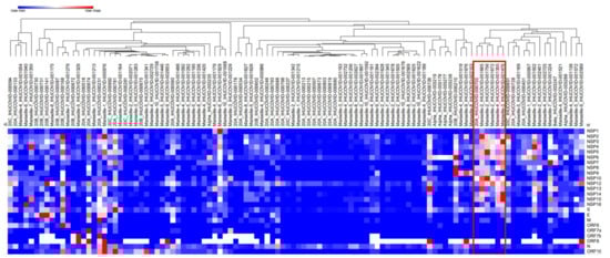 Hierarchical clustering of sets of SARS-CoV-2 next-generation sequencing reads for all 110 samples studied here based on mean intra-sample genetic diversity per 100 nucleotides for each gene. The diversity of all selected positions for this clustering was greater than 4%. The red box indicates a set of six genomes of different lineages with 920 positions exhibiting significant diversity, among which 91 were shared by all the six genomes.