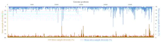 To try correlating at a given nucleotide position the intra-sample genetic diversity in the SARS-CoV-2 genomes studied here and the inter-sample and inter-patient diversity at the largest scale, we superimposed the mean intra-sample genetic diversity for the 110 genomes analyzed here and the global diversity at all SARS-CoV-2 nucleotide positions available from the Nextstrain online tool (https://nextstrain.org/ncov/gisaid/global/all-time (accessed on 30 September 2022)). Nucleotide positions were selected if they exhibited an intra-sample diversity >1% and a non-null inter-sample diversity, in order to detect significant concordances. Thus, 118 nucleotide positions (0.4% of all genome positions) were identified that showed a diversity at the intra-sample as well as inter-patient levels. They included 35 positions in ORF1a, 16 positions in ORF1b, 2 positions in ORF3a, 14 positions in S (spike gene), 2 positions in E (envelope gene), 1 position in ORF7b, 5 positions in ORF8, and 43 positions in N (nucleocapsid gene) (Table 2; Figure 3).