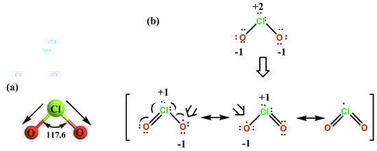 (a) The molecular structure of ClO2. (b) The Lewis structure of ClO2.
