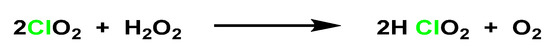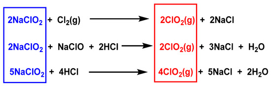 ClO2 is generated from chlorite ions using chemicals, electrochemicals, and biocatalysts, and from the reaction of chlorite with chlorine gas Cl2 or hydrochloric acid (HCl) [25,26,27], as shown in Figure 4.