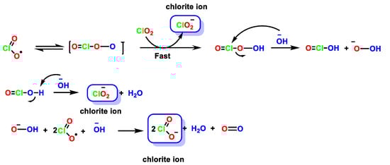 For the formation of ClO2− in basic media, it is proposed that OH- forms an adduct with one of the oxygen atoms of ClO2 to give OClOOH−, and OCl is weakly bound to OOH. This adduct can undergo rapid electron transfer with a second ClO2 to give ClO2− and OClOOH. The latter species reacts favorably with OH− to generate HOClO and HOO−. The reaction between HOO− and ClO2 gives ClO2− and O2 [43], Figure 10.