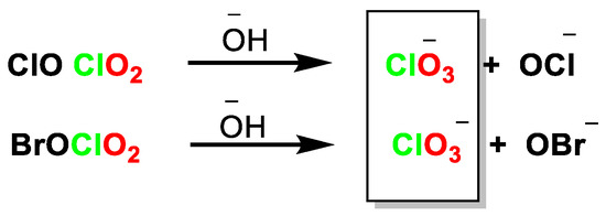 The effect of OX− hypohalite ion catalysis on the disproportionation of chlorine dioxide in basic solution to give ClO2− and ClO3− has been studied. In the first step of hypohalite catalysis (the reaction between ClO2 and OX− involved a transfer of electrons to form ClO2− and OX), this step is reversible [45,46,47], Figure 15.