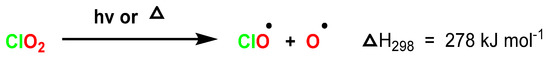 The degradation mechanisms and radical chemistry associated with UVC photolysis of ClO2 are quite complicated [51]. The photolysis of ClO2 by UVC light provides ClO− and oxygen by cleavage of the Cl-O [52] and Cl• [53] bond, Figure 21.