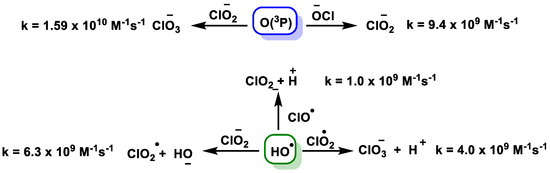 The degradation of ClO2 under UVC radiation accelerates the tendency of chlorite and chlorate formation compared to ClO2 alone. In addition, chlorite and chlorate can also be generated from radical-radical interactions [56,57,58,59], Figure 23.