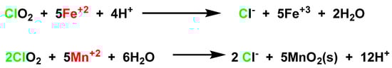 - Van Benschoten, J.E.; Lin, W.; Knocke, W.R. Kinetic modeling of manganese (II) oxidation by chlorine dioxide and potassium permanganate. Environ. Sci. Technol. 1992, 26, 1327–1333. [Google Scholar] [CrossRef]