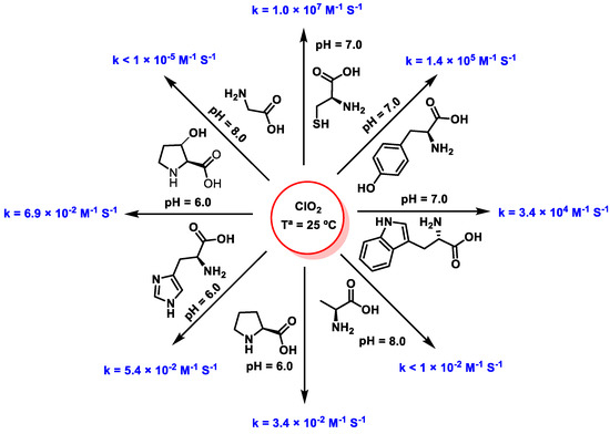Some researchers have studied the reactivity of ClO2 with inorganic and organic compounds has been studied [68]. In the human body, ClO2 can react with I−, NO2−, O3, H2O2, Fe(II), and Mn(II). The rate constants with tertiary amines and phenols were also high at pH ≥ 6. ClO2 does not react with ammonia, Br−, carbohydrates, aromatic hydro-carbides, and compounds containing C=C double bonds at neutral pH conditions.