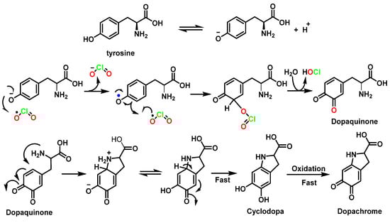 - Napolitano, M.J.; Green, B.J.; Nicoson, J.S.; Margerum, D.W. Chlorine dioxide oxidations of tyrosine, N-acetyltyrosine, and dopa. Chem. Res. Toxicol. 2005, 18, 501–508. [Google Scholar] [CrossRef]