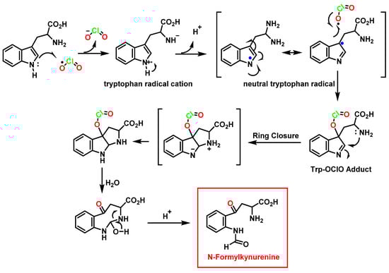 - Stewart, D.J.; Napolitano, M.J.; Bakhmutova-Albert, E.V.; Margerum, D.W. Kinetics and mechanisms of chlorine dioxide oxidation of tryptophan. Inorg. Chem. 2008, 47, 1639–1647. [Google Scholar] [CrossRef]