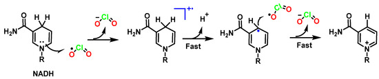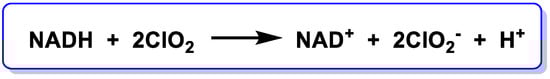- Bakhmutova-Albert, E.V.; Margerum, D.W.; Auer, J.G.; Applegate, B.M. Chlorine dioxide oxidation of dihydronicotinamide adenine dinucleotide (NADH). Inorg. Chem. 2008, 47, 2205–2211. [Google Scholar] [CrossRef] [PubMed]