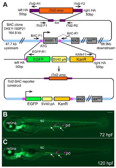 - Suster, M.L.; Sumiyama, K.; Kawakami, K. Transposon-mediated BAC transgenesis in zebrafish and mice. BMC Genom. 2009, 10, 477. [Google Scholar] [CrossRef]
