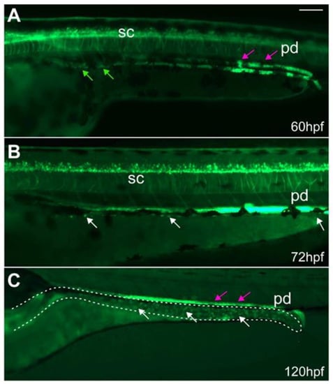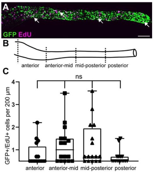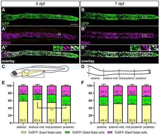 3.4. Enteric Progenitor Cells Are GFP-Positive at Larval Stages