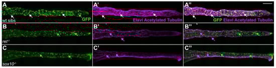 2.7. ret:GFP Positive ENS Cells Are Absent in ret and sox10 Mutants