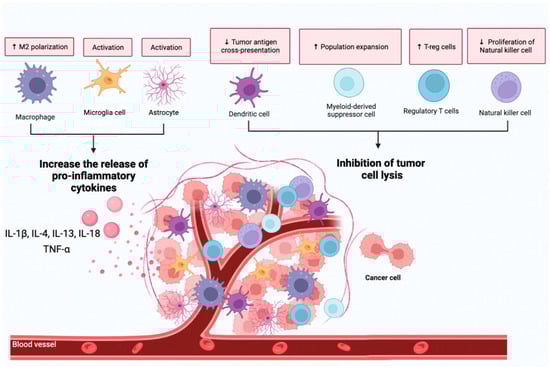 Immunosuppression in brain cancer. The increase of M2 macrophages, activation of microglia and astrogliosis promote a chronic systemic inflammatory environment associated with tumor development and metastasis. In addition, the evasion of the immune system by cancer cells creates an immunosuppressive environment that contributes to tumor growth. The mechanisms of immunosuppression are related to a reduction of the cytotoxic activity of dendritic cells and NK cells and to the increase of cells capable of reducing the activity of CD8+ T-cells such as T-reg and MDSC cells. The figure was created with the help of Biorender.com (accessed on 10 May 2022).