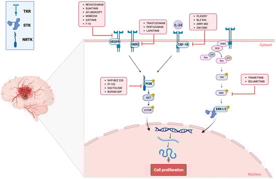4. Strategies for Targeting Malignant Brain Tumors with Kinase Inhibitors: VEGF, HER2, CSF-1R, PI3K, ERKI/II Targeting