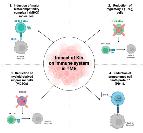 Impact of KIs on immune cells in TME. Some KIs through intrinsic mechanisms linked to the blocking of protein kinases, in addition to reducing the growth of cancer cells, can induce anti-tumor immunity. Some KIs mediated anti-tumor immunity through several mechanisms. These include: induction of MCHI molecules which increases the cytotoxic activity of CD8+ T-cells (panel 1), reduction of T-reg (panel 2), and MDSC cells (panel 3), causing an increase in immune cells and a reduction of PD1 expression on lymphocytes, which increases their cytotoxic activity (panel 4). The figure was created with the help of Biorender.com (accessed on 6 September 2022).