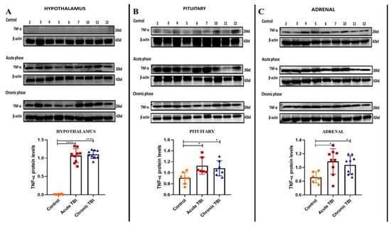 Western blot images and bar graphs of Tnf-α levels in the acute and chronic phase after TBI in the hypothalamus, pituitary, and adrenals. (A) Tnf-α protein levels in the hypothalamus after TBI in the acute, chronic and control groups. (B) Tnf-α protein levels in the pituitary after TBI in the acute, chronic and control groups. (C) Tnf-α levels in the adrenals after TBI in the acute, chronic and control groups. β-Actin was used as a loading control. Data are presented as mean ± SD (n = 9 rats in each group). (* p < 0.05, **** p < 0.0001). All experiments were independently repeated at least twice.