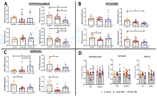 When autophagy is induced, cytosolic Lc3-I is transformed to Lc3-II and localized in autophagosome membranes by the addition of PE. As a result, Lc3-II expression is widely considered to be a sign of autophagy induction []. When autophagy is induced, cytosolic Lc3-I is transformed to Lc3-II and localized in autophagosome membranes by the addition of PE. Both Beclin-1 and Lc3 proteins are crucial autophagy mediators and are involved in distinct phases of the autophagic process []. The Lc3-I protein was not transformed to the Lc3-II (Supplementary Figure S1A–C). Western blot analysis showed that Beclin-1 and Lc3 protein levels were similar in the hypothalamus, pituitary, and adrenal glands in the acute and chronic TBI groups compared to the control group (Figure 2D, Supplementary Figure S1A–C).
