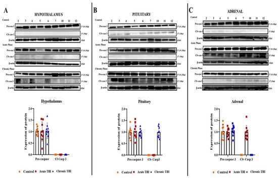 Therefore, we investigated whether autophagy or apoptosis was involved in the regulation of cellular functions in the hypothalamic, pituitary, and adrenal tissues of rats after a mild controlled cortical impact (CCI) model and focused on transcription and protein markers associated with autophagy and apoptosis. The present study revealed the increased apoptosis ratio in the acute phase of TBI in the adrenal glands [,]. Remarkably, in the adrenal tissue, the expression of Clv-caspase-3 was increased in the acute phase, but it was not expressed in the chronic phase. Adrenal insufficiency due to suppression of HPA axis activation emerges in 11–13 percent of all TBI cases, based on clinical evidence [].