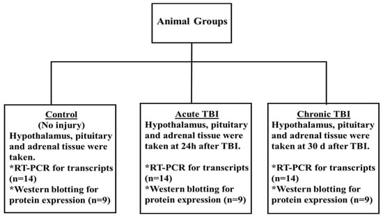 The male rats were randomly divided into three groups, and each group included 14 rats. TBI was generated in rats by using the CCI model [,,]. The details were as follows: (1) control group, no operated group (only opened 10 mm median linear incision was then sutured under anesthesia); (2) acute TBI, rats were sacrificed at 24 h after TBI; (3) chronic TBI, rats were sacrificed 30 days after TBI. mRNA expression analyses were performed on 14 rats for each group. Western blot analyses were performed on nine rats for each group because enough protein was not obtained (excluded sample numbers are indicated on the original Western blot images). All of the findings were derived from the entire total tissue of the hypothalamus, pituitary, and adrenals []. All experiments were performed on randomized and controlled double-blind. Tissue samples were stored in Trizol (Thermo Fisher Scientific, Waltham, MA, USA) at −80 °C until use. The experimental design is provided in Figure 4.
