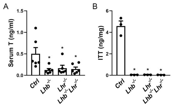 2.3. Testicular Gene Expression Changes and T Levels in Lhb−/− Lhr−/− Double Mutant Are Similar to Those in Mice Lacking either Lhb or Lhr