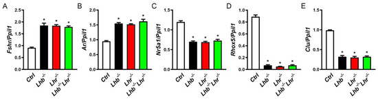 Liu, Z.; Larsen, M.; Lei, Z.; Rao, C.V.; Kumar, T.R. Lhb−/−Lhr−/− Double Mutant Mice Phenocopy Lhb−/− or Lhr−/− Single Mutants and Display Defects in Leydig Cells and Steroidogenesis. Int. J. Mol. Sci. 2022, 23, 15725. https://doi.org/10.3390/ijms232415725