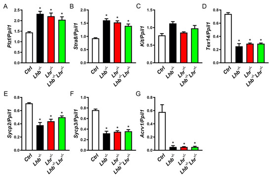 2.2. Lhb−/− Lhr−/− Double Mutant Male Mice Display Testis Phenotypes Similar to Single Null Mice Lacking Only Lhb or Lhr