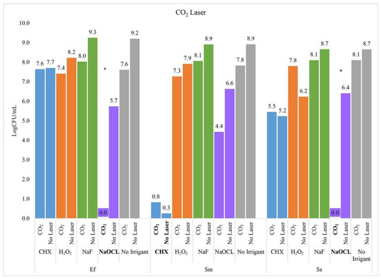 CO2 Laser. Asterisk indicates a statistically significant difference between the two groups (i.e., Laser + Irrigant vs. Irrigant Alone) based on Tukey’s adjusted pairwise comparisons.