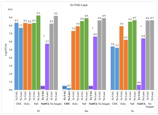 Er:YAG Laser. Asterisk indicates a statistically significant difference between the two groups (i.e., Laser + Irrigant vs. Irrigant Alone) based on Tukey’s adjusted pairwise comparisons.
