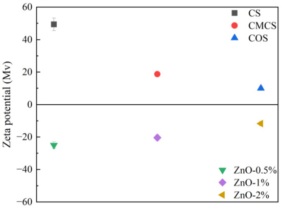 Zeta potentials of chitosan (CS), carboxymethyl chitosan (CMCS), and chitosan oligosaccharide (COS), with ZnO (0.5%, 1%, and 2%).