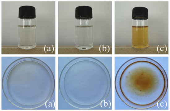 Photographs of the solutions (top) and films (bottom) prepared with 1% (a) chitosan, (b) carboxymethyl chitosan, and (c) chitooligosaccharide from left to right.